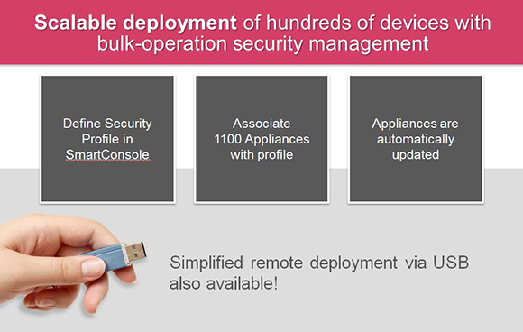 ניהול מרכזי. האדמיניסטרטור יכול להגדיר מדיניות אבטחה לרשת כולה- כולל אבטחה משולבת, אתרים מרכזיים ואתרים מרוחקים- ממכשיר צ'ק פוינט אחד המוצב במיקום מרכזי. בעזרת ה ™- SmartProvisioning, גישת ניהול מבוססת פרופיל מעוצבת עבור הטמעות רחבות, האדמיניסטרטור יכול להגדיר אבטחה יחידה ופרופיל למכשיר וליישם באופן סימולטני על גבי אלפי מכשירי 1100- ובכך להפחית דרמתית בזמן ההטמעה ו"בכאבי הראש" לאדמיניסטרטור.