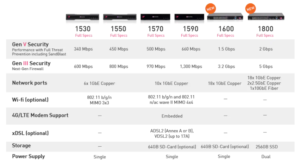| Security | Firewall, VPN, User Awareness, QoS, Application Control, URL Filtering, IPS, Anti-Bot, Antivirus, Anti-Spam and SandBlast Threat Emulation (sandboxing) |