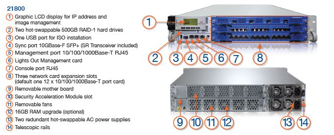 Furthermore, the 21800 also has a slot for an optional Security Acceleration Module. In addition to hot-swappable redundant disk drives and power supply units, the 21800 appliance also supports Lights-Out-Management (LOM) for remote support and maintenance capabilities. The 21800 Appliance is a highly serviceable chassis. Access to all components is easily available from the front and the back of the unit when mounted in the rack.