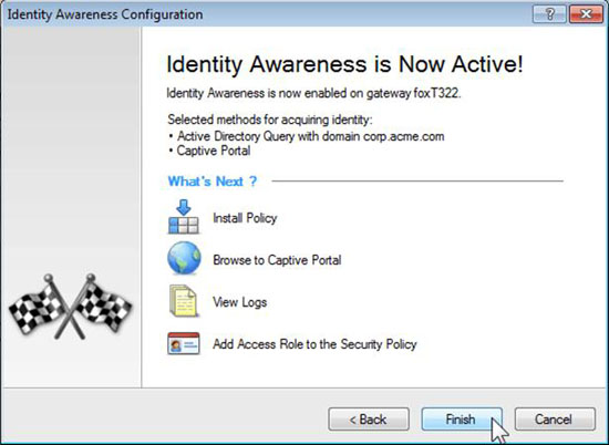 That's all it takes. The Identity Awareness Software Blade will obtaining identity information. If desired, you can change the options that you set in the wizard or deploy other methods, such as identity agents.