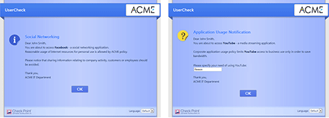 Users are an integral part of the web security and control process. The best practice is to engage and educate users as they use the web to identity potential policy incidents as they occur and remediate them immediately. Check Point UserCheck, a feature of the URL Filtering software blade, enables an organization to implement this best practice saving valuable IT administration time while improving user productivity and overall security.