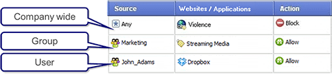 Allow, block or limit web site access based on user, group and even machine-id for a single URL or an entire URL Category.